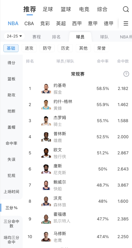 本赛季,约基奇三分命中率高达58.5%,排名联盟第一。