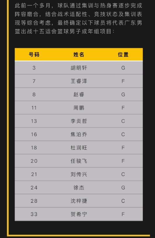 按照规则,全运会最终只能报名12人,如今,广东队的12人终于出炉了,那就是:胡明轩、徐杰、赵睿、王睿泽、周鹏、贺希宁、李炎哲、刘传兴、焦泊乔、杜润旺、任骏飞、沈梓捷。
